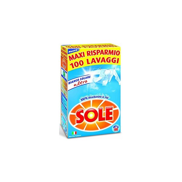Vuoi un bucato bianco, pulito e profumato? Prova il detersivo Sole nel fustino da 100 misurini. Rimuove a fondo la sporcizia garantendo lo sbiancamento dei capi grazie al bicarbonato di sodio. Inoltre igienizza, smacchia e rilascia un profumo fragrante ai tuoi indumenti. È efficace anche in acqua fredda e puoi utilizzarlo per il bucato a mano o per il lavaggi in lavatrice. Il detersivo Sole combina la proprietà sbiancante con gli ingredienti attivi che conferiscono ai tuoi capi pulizia e lucentezza. È disponibile su Cicalia nella confezione economica da 6,5 kg che garantisce 100 lavaggi e il massimo risparmio.