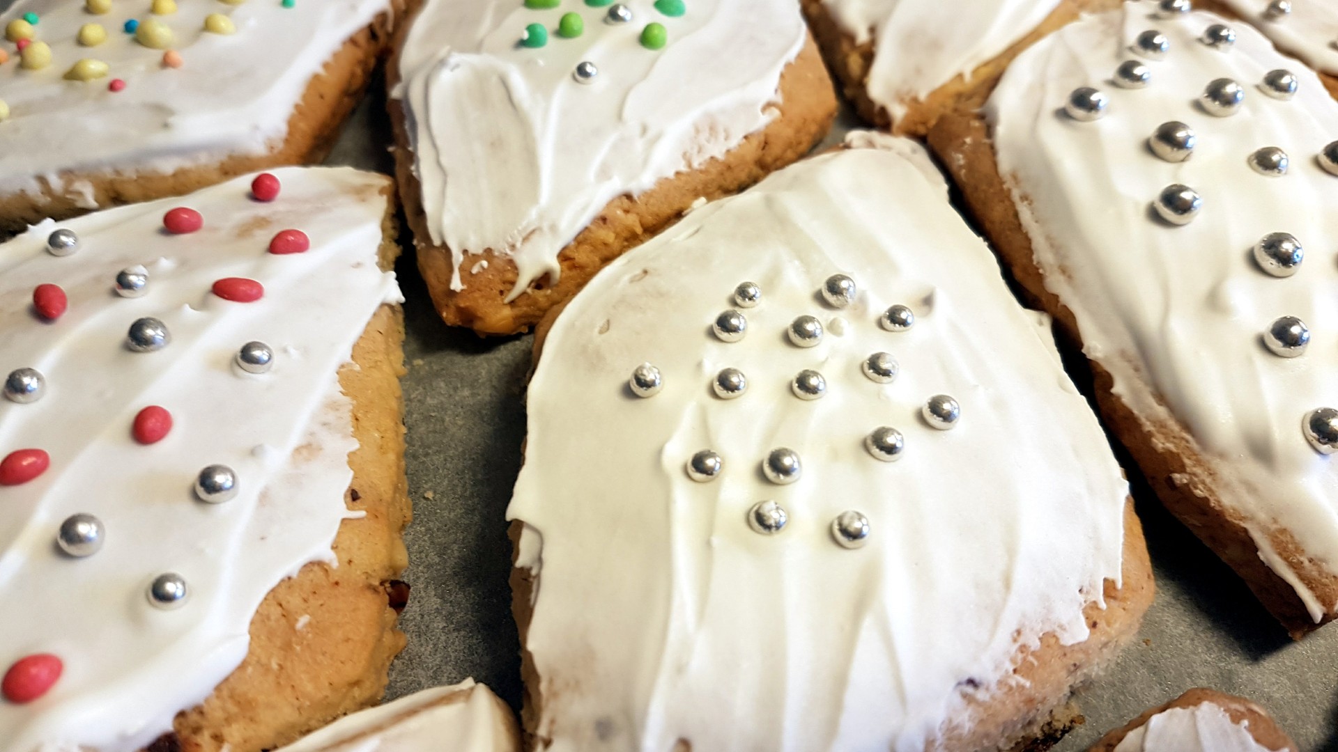 Impasta farina, zucchero, strutto, uova, latte con ammoniaca, mandorle tostate, uvetta e aroma di mandorla. Fai riposare l’impasto un’ora in frigo, poi stendilo a 1 cm e ricava dei rombi. Cuoci a 180° per 30 minuti. Una volta freddi, glassali con zucchero a velo e albumi, poi decora con codette colorate.