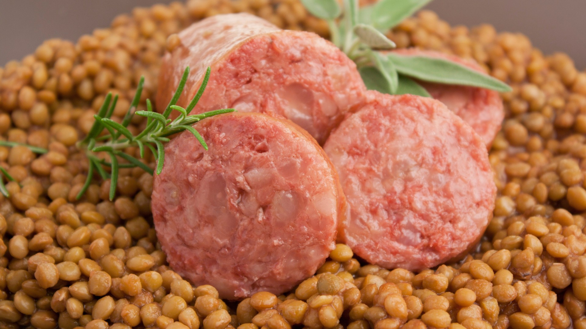 Lava 300 g di lenticchie (ammolla se vuoi), poi soffriggi 1 cipolla, 1 carota e 1 costa di sedano tritati in olio. Aggiungi le lenticchie, copri con brodo caldo, aggiungi 2 foglie di alloro e cuoci fino a cottura desiderata. Nel frattempo cuoci lo zampone precotto in acqua bollente per il tempo indicato, scolalo, affettalo e servilo sopra le lenticchie ben calde.