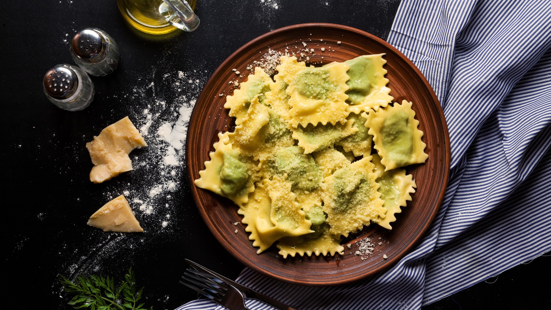 Sbollenta 150 g di spinaci, strizzali bene e tritali; mescolali con 250 g di ricotta, 60 g di Parmigiano, 1 tuorlo, sale e pepe. Impasta 400 g di farina con 4 uova e un pizzico di sale, forma un panetto e lascialo riposare 30 minuti. Stendi la sfoglia sottile, ricava dei quadrati, posa al centro un cucchiaio di ripieno, chiudi a mezzaluna e sigilla. Cuoci i tortelloni in acqua salata e condiscili a piacere.