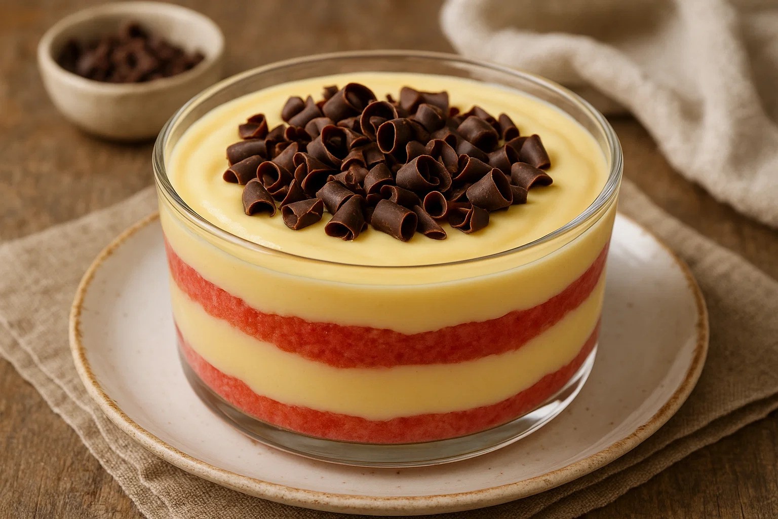 Prepara una crema pasticcera con 500 ml di latte, 4 tuorli, 150 g di zucchero, 50 g di farina e la scorza di 1 limone. Falla raffreddare. In una ciotola, mescola 50 ml di alchermes con 50 ml di acqua e 1 cucchiaio di zucchero. Inzuppa velocemente 200 g di savoiardi (o biscotti tipo oro saiwa) nella bagna e disponine uno strato sul fondo di una pirofila. Copri con uno strato di crema, poi un altro strato di biscotti inzuppati. Continua ad alternare gli strati fino a esaurimento degli ingredienti, terminando con la crema. Lascia riposare in frigo per almeno 4 ore, spolvera con cacao amaro prima di servire. Un dolce iconico, cremoso e profumatissimo!