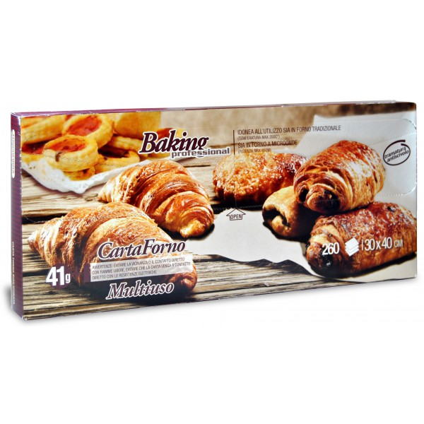 Se ami le ricette che prevedono la cottura al forno, la carta Baking Professional non può mancare nella tua cucina. È pratica e già tagliata in 260 fogli da 30 x 40 cm.
